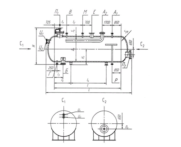 Отстойники воды имеют вид металлических сварных сосудов. Емкости проектируются с торцами полусферической формы, устанавливаются на седловые или стоечные опоры. Одна из опор неподвижная, вторая — регулируемая. В стенке корпуса предусмотрены люки с крышками и патрубки для подключения к технологической линии и монтажа навесного оборудования. Это входной и выходной патрубки, штуцеры для дренажа, выход газа, уровнемеры, датчики давления. В комплект поставки входит зажим заземления, внутренняя лестница, строповое устройство. Комплектация оборудования подбирается на этапе проектирования с учетом особенностей производственного процесса.